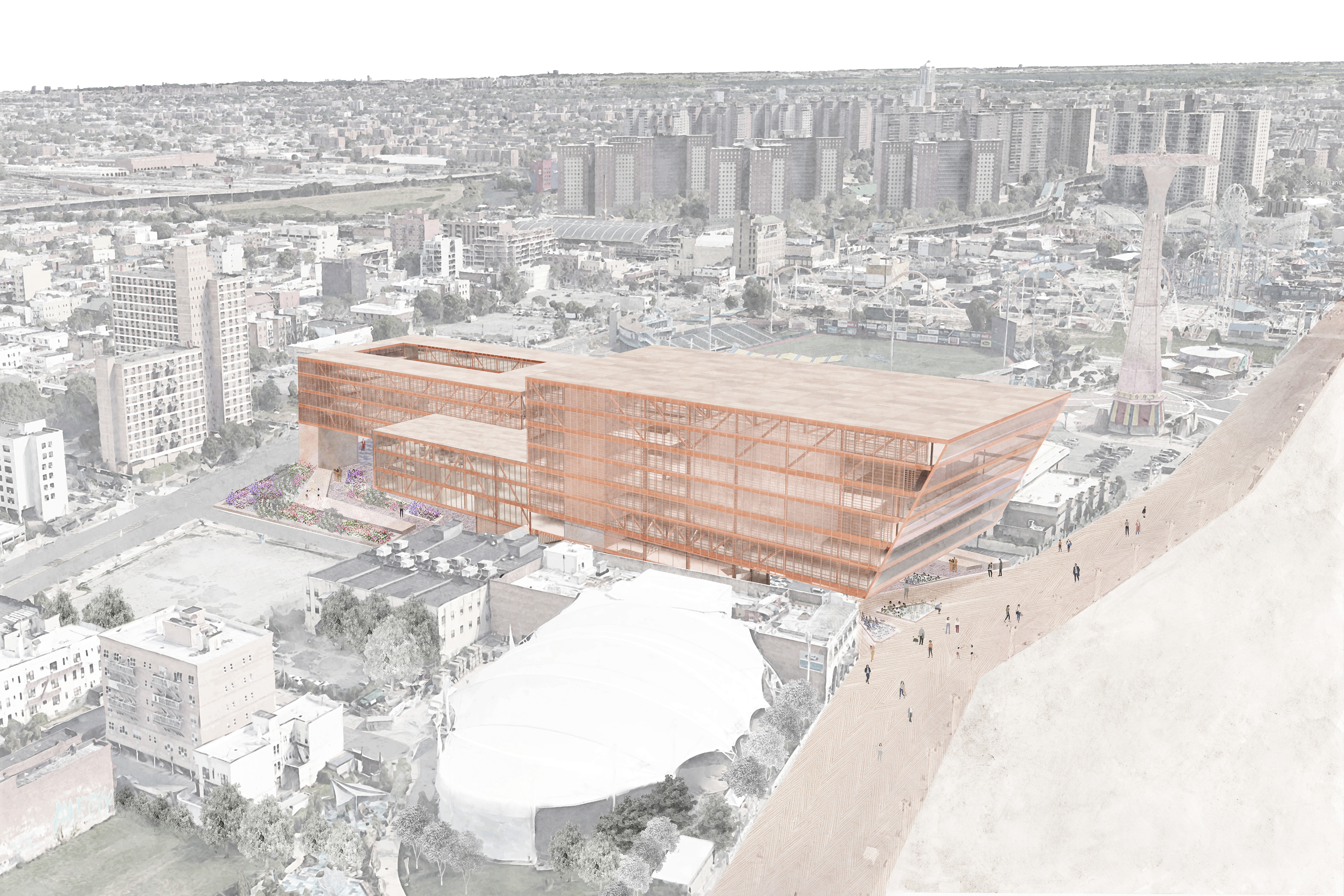 Aerial view of the Coney Island Urban Park, situated between the boardwalk and the city.
